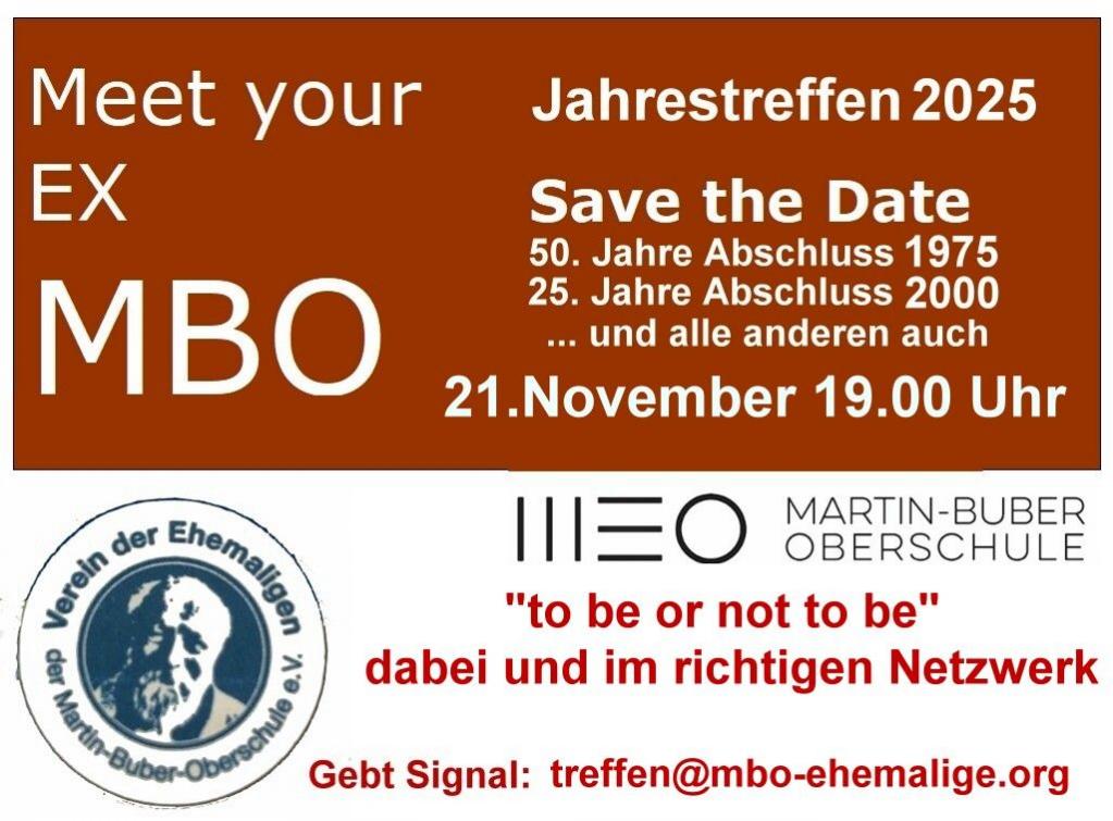 auf der neu gestalteten Webseite des bereits 2002 errichteten Vereins der Ehemaligen der Martin-Buber-Oberschule in Berlin von Spandau. Diese Webseite ist unsere Visitenkarte für und an Euch. Gerne würden wir Euch bei uns als neues oder erneutes Mitglied, als Partner für den Austausch und die Gewährleistung unserer Ziele gewinnen. Die Webseite selbst beschränkt sich auf die Mitteilung wesentlicher Informationen über den Verein und für Ehemalige vielleicht nützliche Termine. Gerne teilen wir auch MBO-bezogene Termine mit. Seien sie unserer eigenen oder der Initiative der Schüler oder MBO selbst zu verdanken.